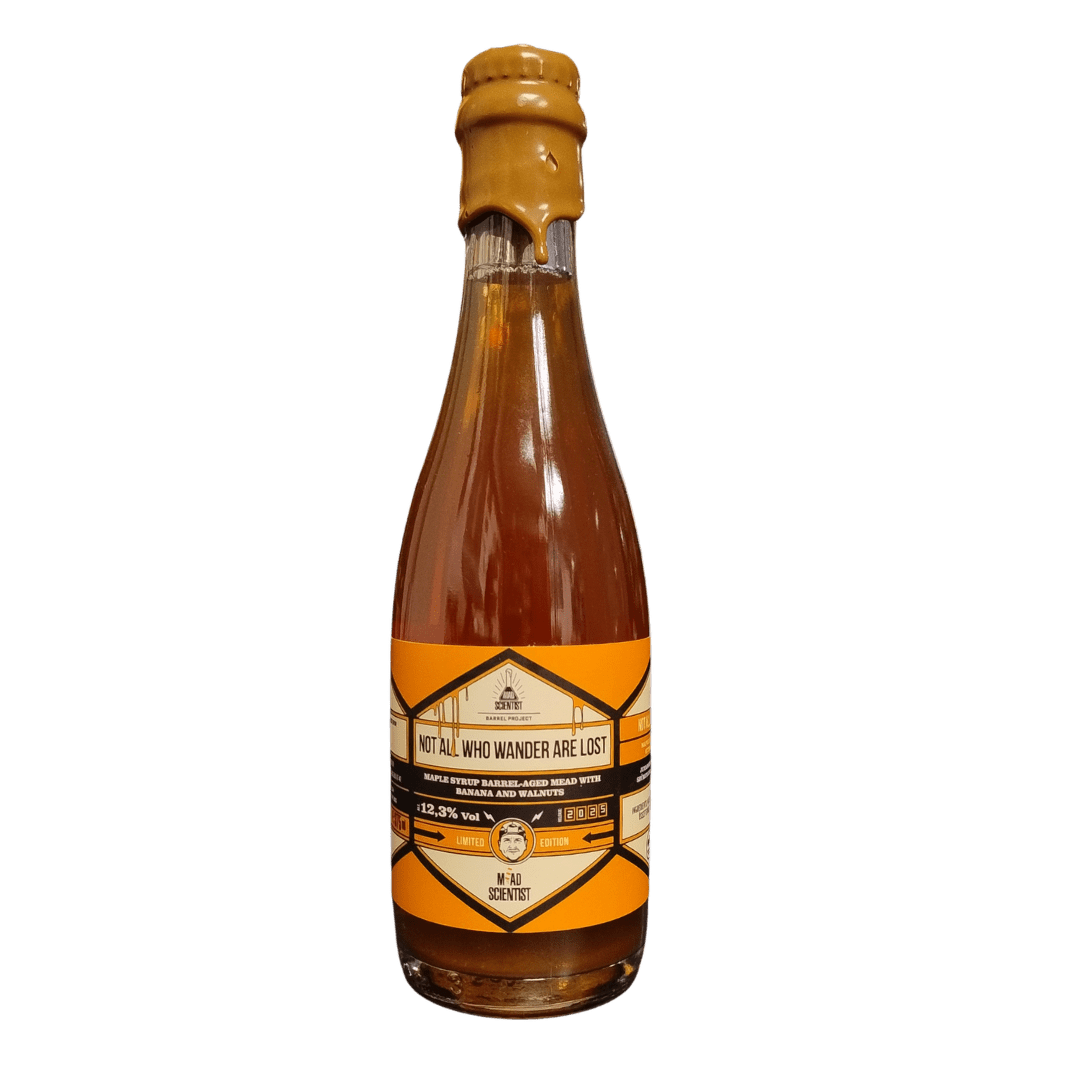 Not All Who Wander Are Lost is een verkenningstocht van smaken in de vorm van een eikenhouten gerijpte mead. Deze bijzondere mead is gerijpt op esdoornhouten vaten, wat het bier een subtiele zoetheid en houtachtige diepte geeft. Het wordt verder verrijkt met de romige smaken van rijpe banaan en een nootachtige toets van walnoot, die perfect in balans worden gebracht door de zachte esdoornsiroop. Het resultaat is een complex, maar toegankelijk brouwsel met een verfijnde zoetheid, een romige textuur en een bevredigende, subtiele bitterheid van de walnoot.