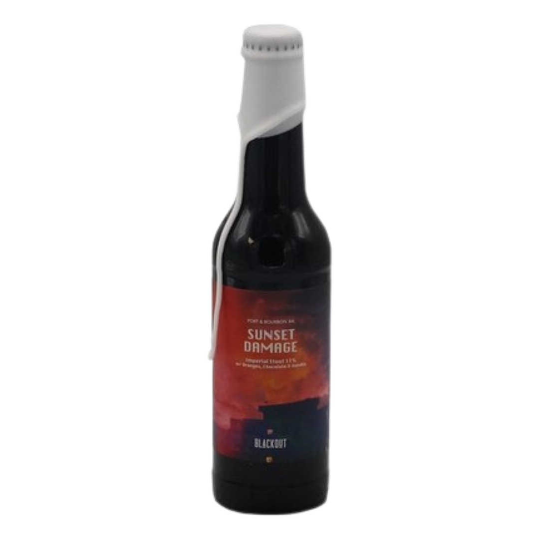 Sunset Damage is een meesterlijke blend van stouts, zorgvuldig gerijpt in ruby portwijnvaten en MGP bourbonvaten. Dit barrel-aged bier combineert de fruitige zoetheid van port met de warme, rijke karakteristieken van bourbon. Elke slok onthult lagen van chocolade, vanille en een subtiele hint van sinaasappel, waardoor een complex, fluweelzacht en gelaagd bier ontstaat.